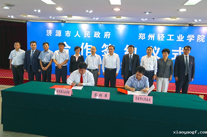 在徐济超副省长等领导嘉宾的见证下,双方代表进行了正式签约。我校校长赵卫东与济源市政府代市长张宇松共同签署《济源市人民政府与郑州轻工业学院战略合作协议书》;我校副校长吕彦力与济源职业技术学院院长陈学军共同签订联合办学协议。