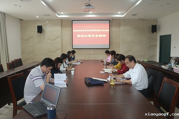 食品与生物工程学院召开的全体教职工会议,传达学习了学校第四次党代会精神。学院要求各支部通过各种形式深入学习贯彻学校第四次党代会精神,把学习贯彻党代会精神与学习贯彻党的十九大精神结合起来,与当前学校和学院的各项工作任务结合起来,进一步统一思想、凝聚共识、立足岗位、开拓创新,引领学院全体教职工生在学校实现新发展新跨越的过程中做出新的更大的贡献。