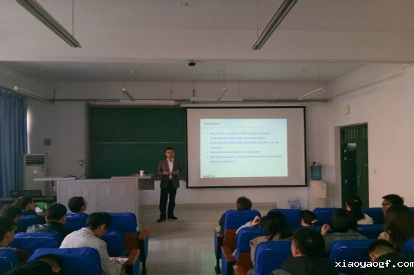 11月26日上午,应我校材料与化学工程学院、河南省表界面科学重点实验室邀请,兰州大学国家杰出青年基金获得者张浩力教授在科学校区化工楼218室做了题为 “二维纳米材料的溶液法制备与非线性光学性质研究”的学术报告,相关专业教师、全体研究生和部分本科生参加报告会。