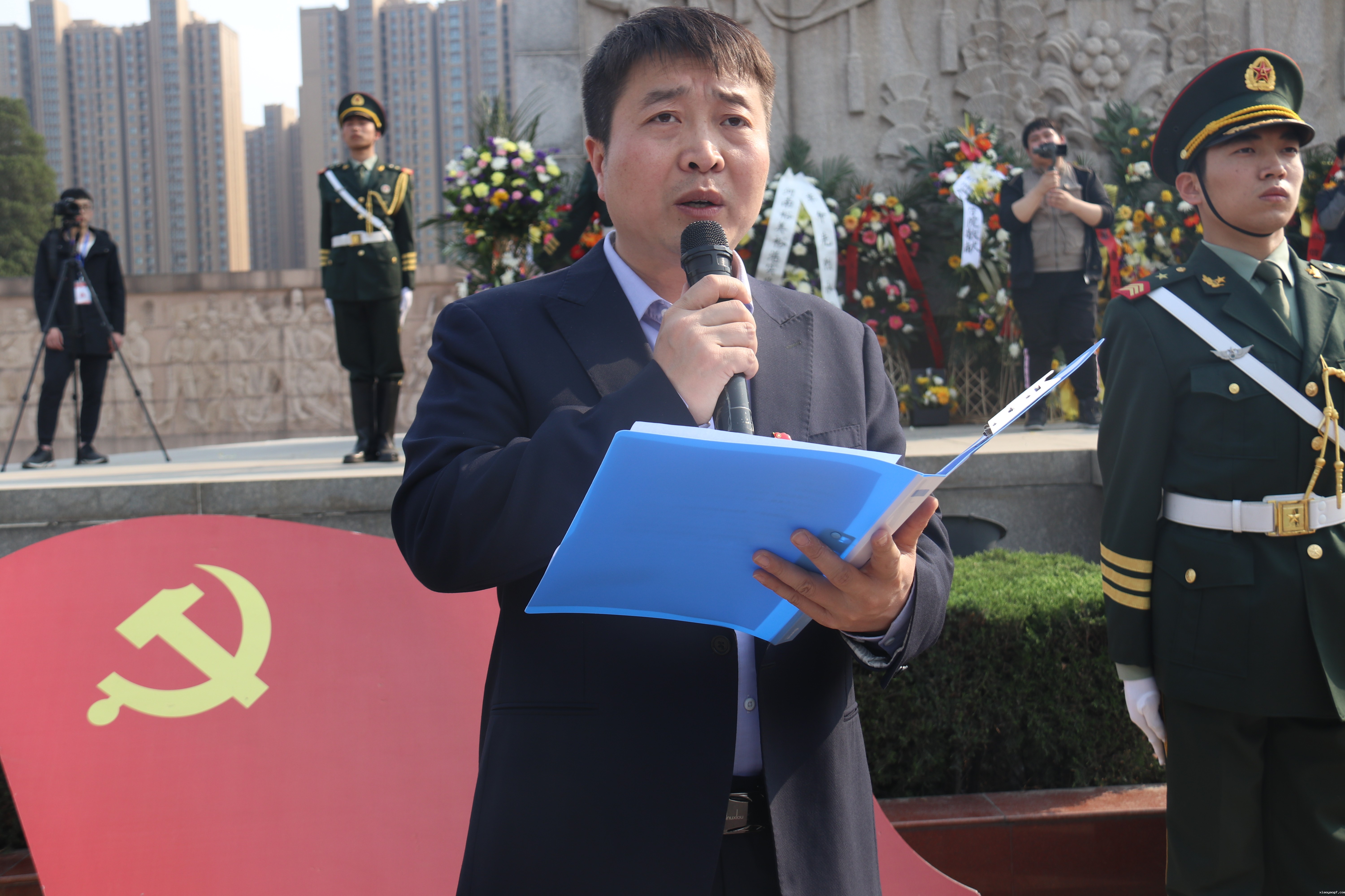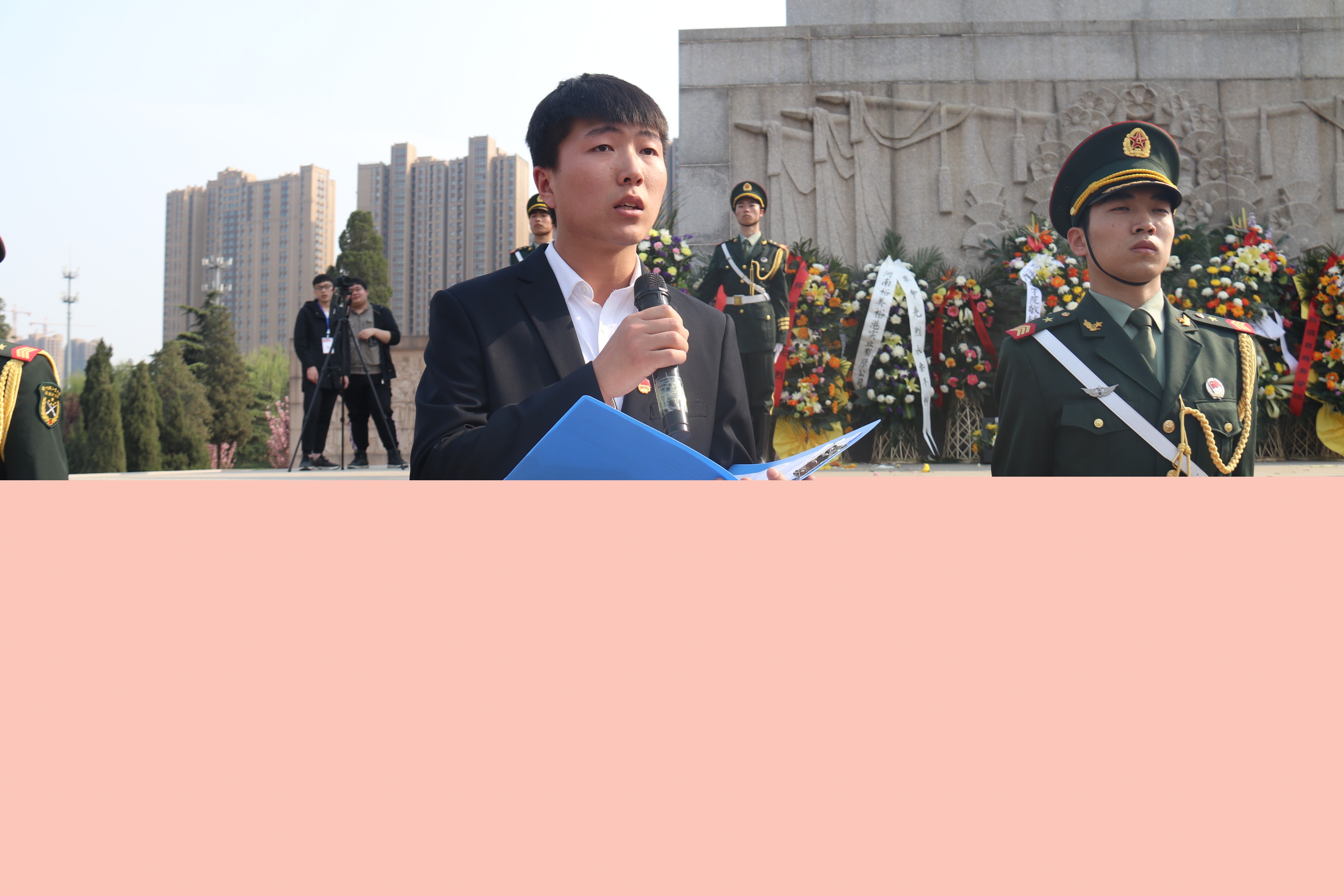 老师和同学们迈着沉重的步伐,怀着对烈士们的无限崇敬,来到烈士纪念碑前。主持人宣布祭奠英烈活动开始,标兵就位,礼兵献花篮,全体默哀三分钟,师生依次向烈士纪念碑敬献鲜花。国旗护卫队出国旗,全体人员合唱了国歌,面向国旗,校学生会主席团成员孟振同学带领大家做了国旗下宣誓。随后团委副书记王银峰老师作了一场题为《传承红色基因 争做时代青年》的微团课,学生代表陈星铎以《追思先烈音容,朝气蓬勃建功新时代》为主题作了团旗下主题发言,从不同角度怀念先辈英烈的光荣事迹,勉励大家做有志、有为时代新青年。