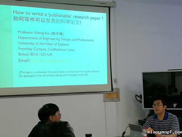 6月18日下午,6月19号上午,应我校邀请,英国西英格兰大学姚宇峰教授来我校东风校区西三楼215会议室做了“How to Write a Publishable Paper”,“Writing skills for English articles”学术报告。相关专业教师、研究生、本科生聆听了报告。