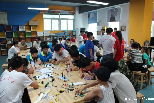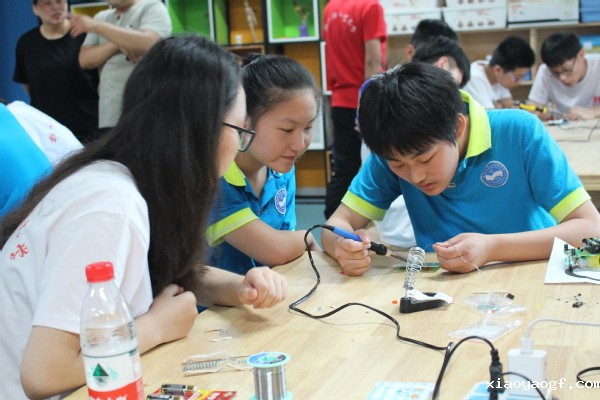 7月12日,教育关爱小分队在院党总支副书记孙琳老师和指导老师孔馨雨的带领下来到了河南省商丘永城市第三初级中学。小分队队员们根据自身专业知识和特长向当地青少年分别介绍了3D打印技术、智能寻迹小车、扫地机器人等现代化科技创新产品,学生们听得津津有味。为了让当地的青少年们对这些知识有更深入的了解,小分队队员向他们展示了自制的智能循迹小车、光立方和音乐节拍器等科技创新作品。在展示并介绍了它们的工作原理后,小朋友们的好奇心被安全调动起来,争相参与其中。随后,小分队队员们又细心地向孩子们介绍了一些基本的用电知识和和焊接注意事项,并且带领小朋友们进行了简单的电路板焊接练习。
