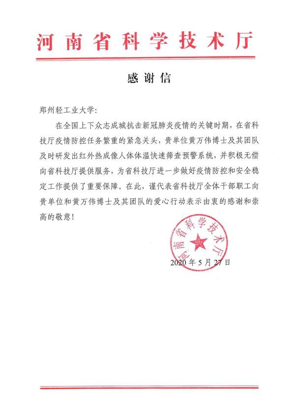 信中说到,在全国上下众志成城抗击新冠肺炎疫情的关键时期,在省科技厅疫情防控任务繁重的紧急关头,黄万伟及其团队及时研发出红外热成像人体体温快速筛查预警系统,并积极无偿向省科技厅提供服务,为省科技厅进一步做好疫情防控和安全稳定工作提供了重要保障。为此,省科技厅全体干部职工向我校和黄万伟及其团队的爱心行动表示由衷的感谢和崇高的敬意。