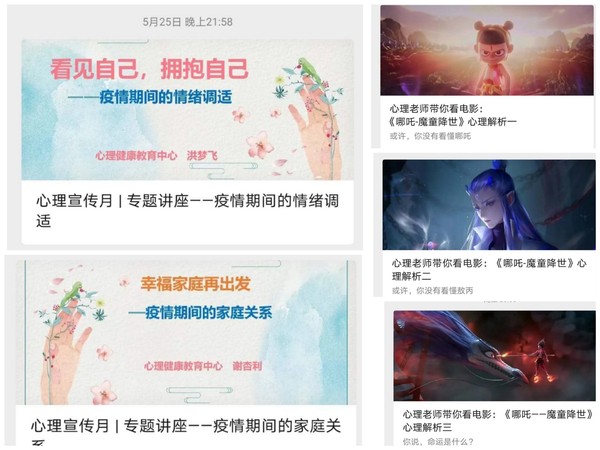 心理健康教育中心专职教师结合学生近期的心理需求和兴趣分别开展了题为《看见自己,拥抱自己——疫情期间的情绪调适》、《幸福家庭再出发--疫情期间的家庭关系》、《心理老师带你看电影:〈哪吒——魔童降世〉心理解析》的专题讲座,先后通过线上直播和微信公众号回放的方式推出,累计观看师生千余人。