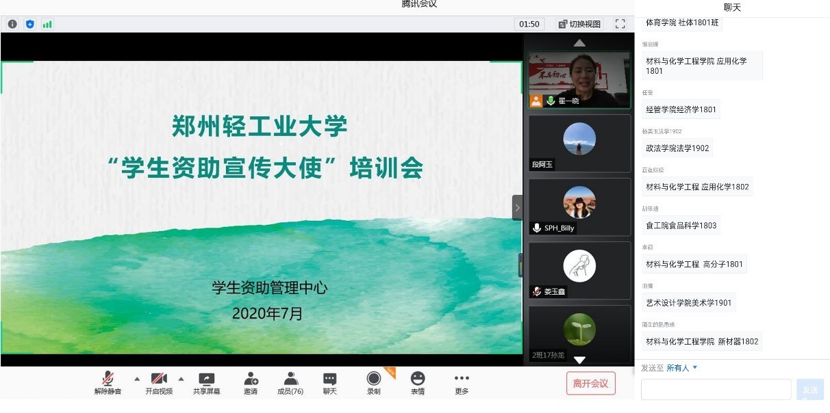 从国家奖学金、国家励志奖学金等受助学生中选拔优秀代表担任“学生资助宣传大使”。为提高宣传走访活动的专业性和安全性,学生资助中心专门组织开展资助政策“云讲堂”,由资助中心办公室主任翟一晓老师主讲,全校98名“学生资助宣传大使”参加。讲堂中,翟老师全方位解读了国家和学校的资助政策,详细介绍了我校“奖、助、贷、补、减”和“新生绿色通道”六位一体的资助体系,生动诠释了金融征信的重要性,尤其强调了疫情防控期间开展政策宣传活动的个人防护等注意事项。要求“资助宣传大使”在确保安全的前提下,提高责任意识和感恩意识,积极主动地做资助政策的学习者、传播者和知恩感恩的践行者,让党和国家的资助政策惠及更多经济困难家庭。