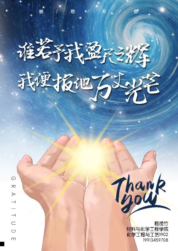 资助创意设计作品大赛由艺术设计学院承办,共收到182件作品。设计作品形式多样,寓意贴切,内涵丰富,或饱含对祖国的热爱之情,或表达对国家资助的感激之情、感恩之心;或展现对未来的憧憬,对幸福的追求;或诠释对理性消费、远离不良“校园贷”的决心;或彰显努力担当民族复兴大任的坚定意志。作品《谁若予我盈尺之辉,我便报他万丈光芒》以黑夜里的盈尺之辉使人得以在黑暗中砥砺前行,寓意新时代大学生应不忘初心,知恩感恩。作品《诚信伴明月》将诚信比作每日相伴的日月,突出诚信是做人之根本,立业之基。大赛共评选出一等奖5项,二等奖10项,三等奖15项,优秀奖20项。(获奖名单见附件1)