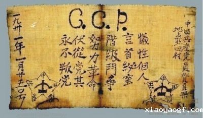 这份入党宣誓书收藏在中国国家博物馆,也是现存最早的入党誓词文物。入党宣誓书的中间是入党誓词,从右向左分别是:“牺牲个人,言(严)首(守)纟必(秘)蜜(密),阶级斗争,努力革命,伏(服)从党其(纪),永不叛党”;正面上方写着中国共产党的英文缩写“CCP”;右侧的落款是中国共产党员贺页朵,地点北田村,左侧是时间,1931年1月25号。