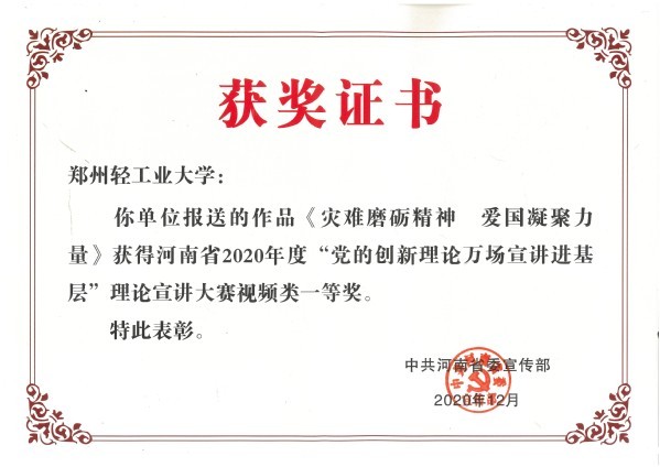 近日,由省委宣传部主办的河南省2020年度“党的创新理论万场宣讲进基层”理论宣讲大赛结果揭晓,由党委学工部设计制作,机电工程学院辅导员孔馨雨主讲的理论宣讲微视频《灾难磨砺精神爱国凝聚力量》获得大赛视频类一等奖(全省共两项)。