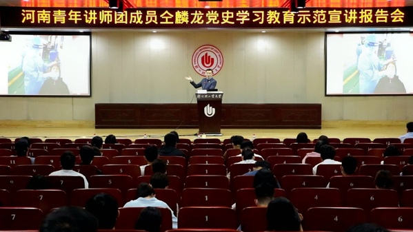 为大力弘扬伟大抗疫精神,激励和引领广大青年进一步坚定制度自信,推动党史学习教育在我校落地落实落细,5月6日下午,河南青年讲师团成员、郑州人民医院团委副书记、河南省第五批驰援湖北医疗队青年突击队队长仝麟龙到我校作党史学习教育示范宣讲报告会,校团委全体人员、校青年讲师团成员、各学院团干、辅导员、班主任代表、校院两级青马班学员、青马学会会员共计三百余人参加报告会,会议由校团委负责同志主持。