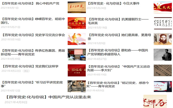 开展“课前十分钟学党史”系列活动,42名班主任走进课堂,以“中国共产党为什么能建立新中国”“缅怀革命先烈,传承红色基因”“红色书信-印记光辉岁月”为主题开展党史教育;树立“一支部一品牌”,各党支部发挥自身优势,丰富学习内容和形式,广泛开展红色故事人人讲、红色热土忆初心、红色经典诵读、读书交流会、党史故事分享会、重温入党誓词、微党课、观看专题片等活动,参与师生逾千人次,举办各类活动近百场。学院公众号推送“百年党史·化与你说”系列推文十余篇,阅读点击量三千余次,线上和线下联合互动,在全院上下掀起了党史学习教育的热潮。