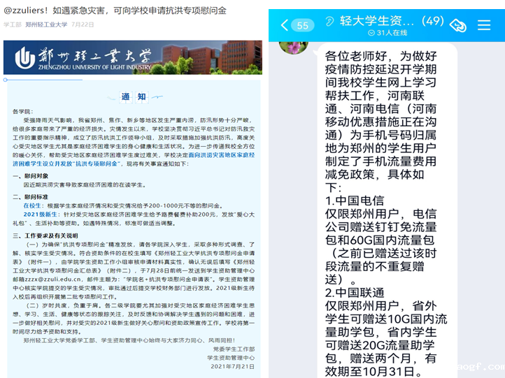 面对汛情和疫情的双重考验,学校启动应急资助,第一时间发布了《关于向洪涝灾害地区家庭经济困难学生发放抗洪专项慰问金的通知》,开通汛期资助救助热线,设立“抗洪专项慰问金”。各学院全面开展对受灾学生的排查工作,广大学工干部、全体辅导员老师通过微信、QQ、电话等形式,“一对一”对省内学生进行“云”家访,建立受灾严重地区学生信息台账,为851名受灾学生发放39.67万抗洪专项救助金,确保“摸排全覆盖、关爱及时到”。秋季学期开学后,学校将为受洪涝灾害影响严重的家庭经济困难学生提供最高档资助,通过“六位一体”资助政策体系为受灾学子筑起抗汛救灾的“资助堤坝”。此外,学生资助管理中心主动对接河南移动、河南联通、河南电信对学生网络学习流量进行补贴,助力保障“停课不停学”。
