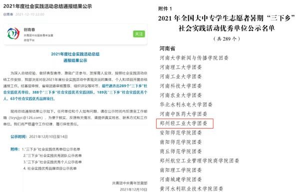 近日,团中央对2021年度全国社会实践活动开展情况的通报正式下发,我校再次荣获全国大中专学生志愿者暑期“三下乡”社会实践活动优秀单位。同时,学校荣获全国“百强实践团队”1支、“千校千项”奖项21项、“镜头中的三下乡”奖项7项、“我的返家乡实践故事”优秀作品1项,经统计本年度社会实践国家级获奖数量居河南省高校首位。