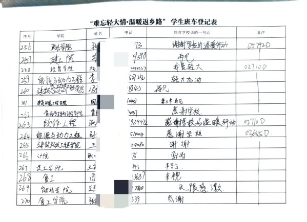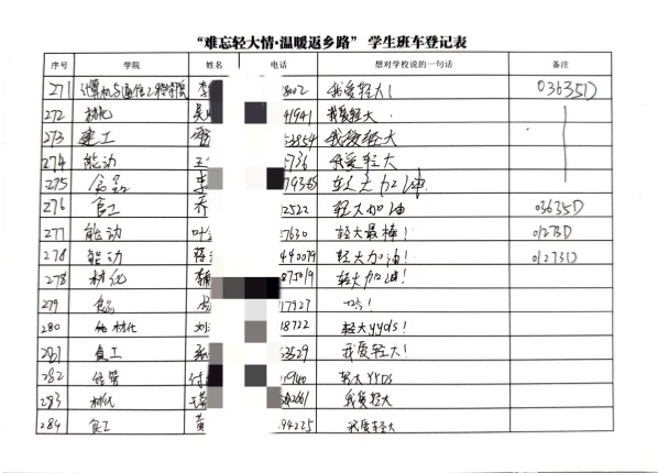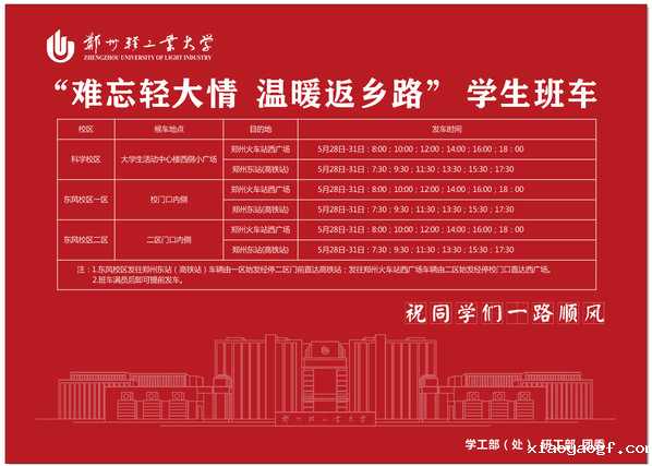 学校为帮助学生安全顺利返家,增强学生爱校荣校意识,经过学工部(处)、研工部、团委的老师们不懈努力,多方协调,反复沟通,最终开通了“难忘轻大情 温暖返乡路”学生班车。