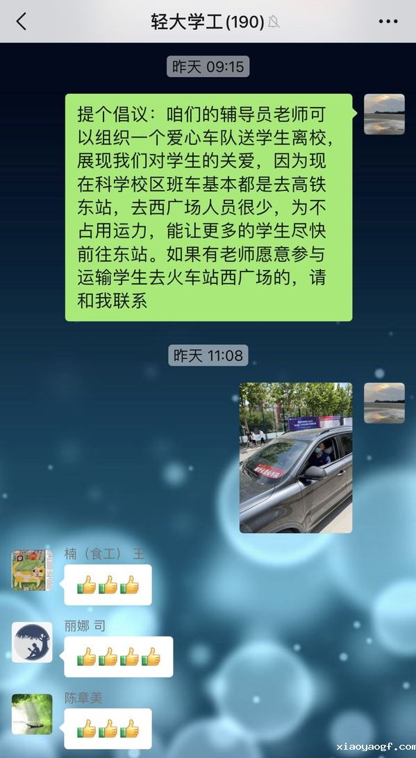 在短短二十分钟里,群内的辅导员们就自发组成了辅导员爱心车队,将学生安全、快速的送往目的地。
