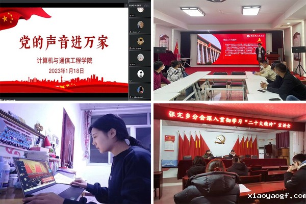 计算机与通信工程学院、政法学院和外国语学院利用寒假学生返乡时机组成理论普及小分队在福建省翔安区、山东省壮岗镇、河北省虹桥镇、天津市南开区、河南省张完乡等地开展党的二十大精神进社区、进乡村、进企业宣传活动。同学们重点围绕党的二十大提出的全面推进乡村振兴、坚持教育优先发展、实现全体人民共同富裕等贴近群众生产生活实际的政策进行详细阐述,用通俗易懂、简明直白的话语传递党的声音,用实际行动助力打通基层宣讲的“最后一公里”,让党的二十大精神“飞入寻常百姓家”。